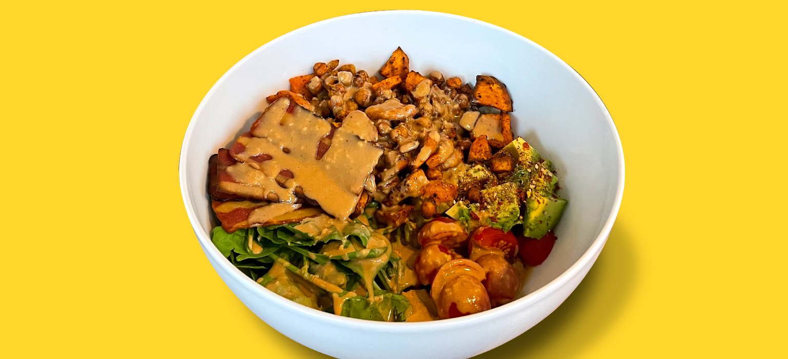 Reis als Basis in Schüsseln geben. Süßkartoffeln, Kichererbsen, Babyspinat, Cherrytomaten und Avocado darauf verteilen. Mit veganem Bacon und Sesam garnieren. Die Bowl mit dem Tahin-Dressing beträufeln und mit devtig Avocado Topping abschmecken.