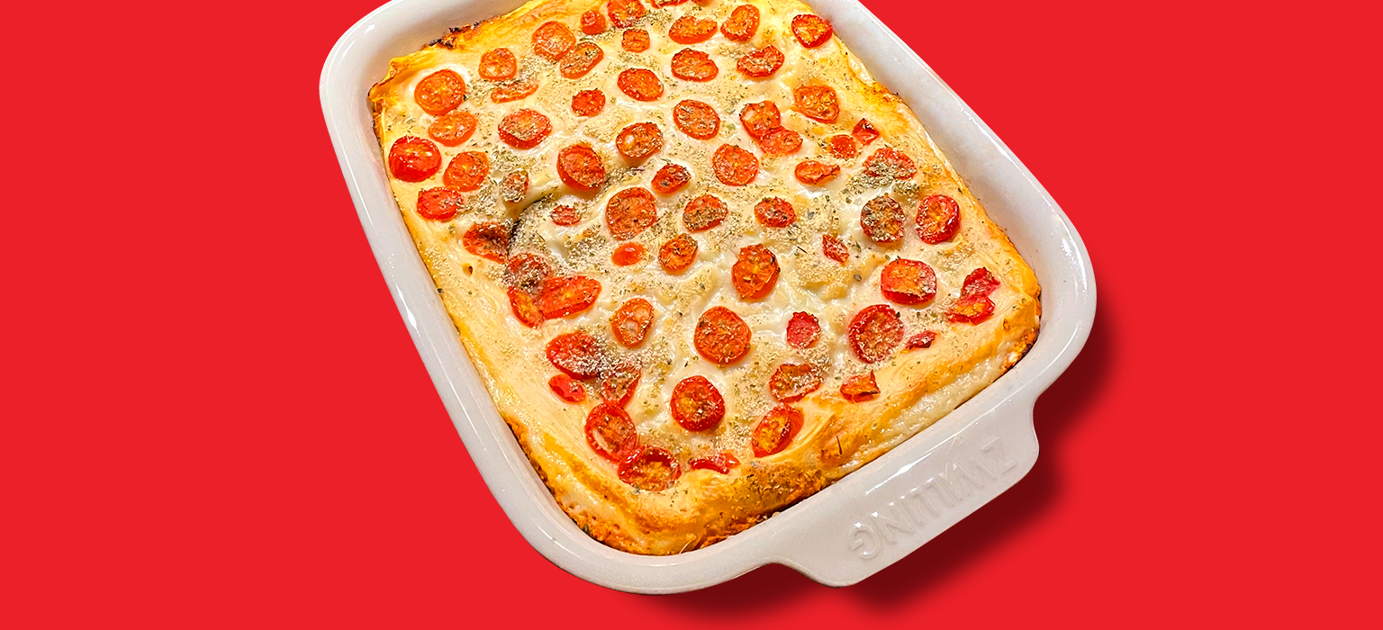 Eine abschließende Schicht Béchamelsoße auf die obersten Lasagneblätter geben. Mit Tomatenscheiben belegen und Semmelbrösel darüber streuen.